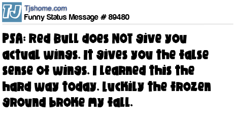 X PSA: Red Bull does NOT give you actual wings. It gives you the false sense of wings. I learned this the hard way today. Luckily the frozen ground broke my fall.