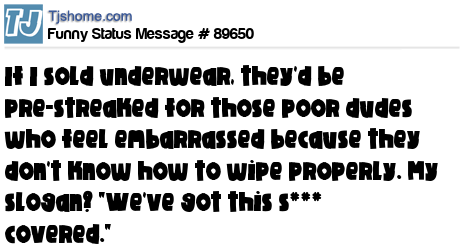 X says If I sold underwear, they'd be pre-streaked for those poor dudes who feel embarrassed because they don't know how to wipe properly. My slogan? "We've got this s*** covered."
