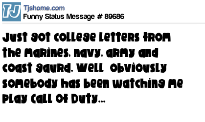 X is just got college letters from the marines, navy, army and coast gaurd. Well obviously somebody has been watching me play Call Of Duty...