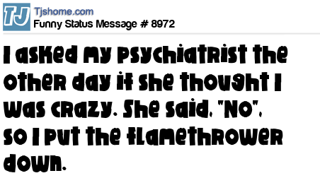 X I asked my psychiatrist the other day if she thought I was crazy. She said, "No", so I put the flamethrower down.