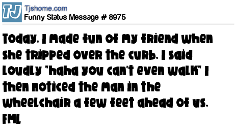 X Today, I made fun of my friend when she tripped over the curb. I said loudly "haha you can't even walk" I then noticed the man in the wheelchair a few feet ahead of us. FML