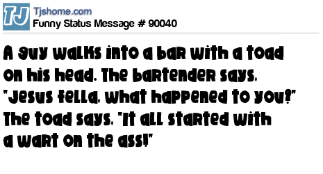 X is A guy walks into a bar with a toad on his head. The bartender says, "Jesus fella, what happened to you?" The toad says, "It all started with a wart on the ass!"