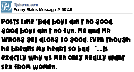 X says Posts like "Bad boys ain't no good, good boys ain't no fun. Me and Mr Wrong get along so good, Even though he breaks my heart so bad ♥"....Is exactly why us men only really want sex from women.