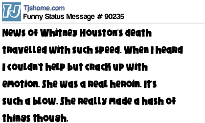 X is News of Whitney Houston's death travelled with such speed. When I heard I couldn't help but crack up with emotion. She was a real heroin. It's such a blow. She really made a hash of things though.