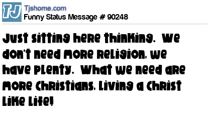 X says Just sitting here thinking. We don't need more religion, we have plenty. What we need are more Christians, living a Christ like life!