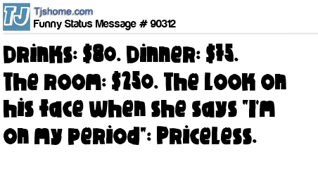 - # 3138 text from a female: "Flowers- 20. Dinner-50. Drinks- 25. Hotel- 150. The look on his face when I tell him I'm on my period? Priceless."