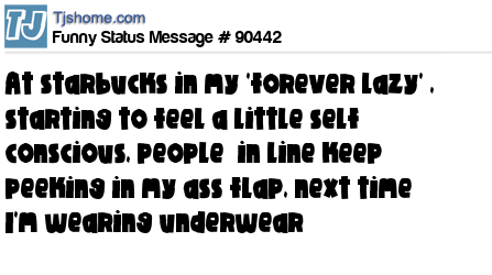 X is at starbucks in my 'forever lazy' , starting to feel a little self conscious, people in line keep peeking in my ass flap, next time I'm wearing underwear