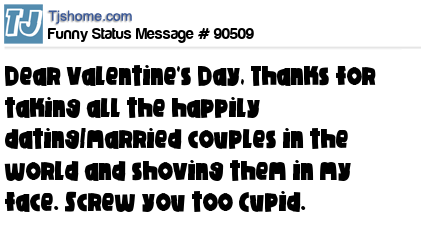 X is Dear Valentine's Day, Thanks for taking all the happily dating/married couples in the world and shoving them in my face. Screw you too Cupid.