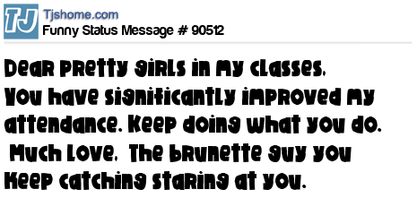 X Dear pretty girls in my classes, You have significantly improved my attendance. Keep doing what you do. Much love, The brunette guy you keep catching staring at you.