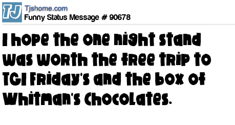 X says I hope the one night stand was worth the free trip to TGI Friday's and the box of Whitman's Chocolates.