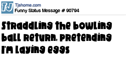 X is straddling the bowling ball return, pretending I'm laying eggs