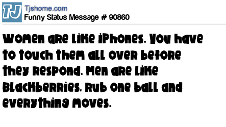 - # 134175 Women are like iPhones, you have to touch them all over before they respond. Men are like Blackberries, rub one ball and everything moves.