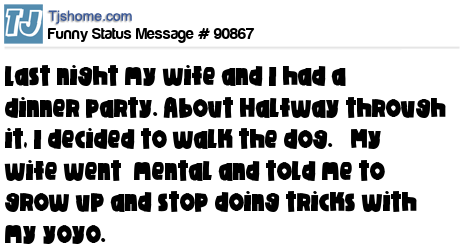 X is Last night my wife and I had a dinner party. About Halfway through it, I decided to walk the dog. My wife went mental and told me to grow up and stop doing tricks with my yoyo.