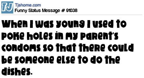 X says When I was young I used to poke holes in my parent's condoms so that there could be someone else to do the dishes.