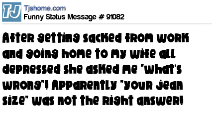 X says after getting sacked from work and going home to my wife all depressed she asked me "what's wrong"! Apparently "your jean size" was not the right answer!