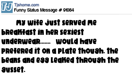 X is my wife just served me breakfast in her sexiest underwear....... would have prefered it on a plate though. the beans and egg leaked through the gusset.