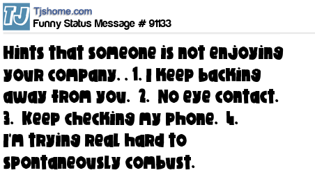 X is Hints that someone is not enjoying your company. . 1. I keep backing away from you. 2. No eye contact. 3. Keep checking my phone. 4. I'm trying real hard to spontaneously combust.