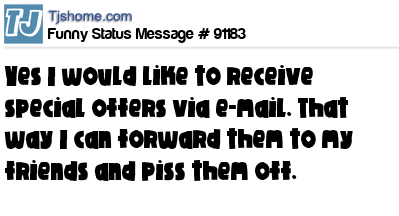 X Yes I would like to receive special offers via e-mail. That way I can forward them to my friends and piss them off.