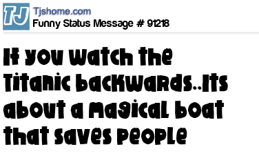 - # 70080 If you watch Titanic backwards, . It is a heart warming tale of a Ship Which jumps out of the water And Saves lots of drowning people . . .