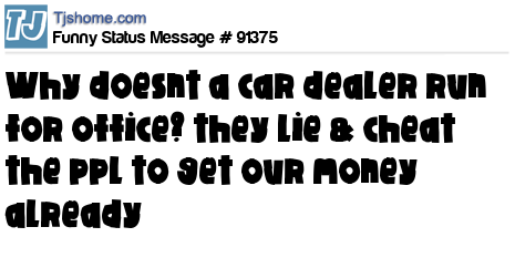 X says why doesnt a car dealer run for office? they lie & cheat the ppl to get our money already