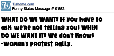 X WHAT DO WE WANT? If you have to ask, we're not telling you! WHEN DO WE WANT IT? We don't know! -Women's protest rally.
