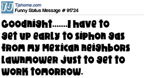 X Goodnight.......I have to get up early to siphon gas from my Mexican neighbors lawnmower just to get to work tomorrow.