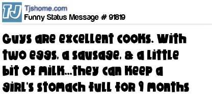 X says Guys are excellent cooks. With two eggs, a sausage, & a little bit of milk...they can keep a girl's stomach full for 9 months