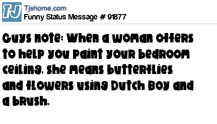 X Guys note: When a woman offers to help you paint your bedroom ceiling, she means butterflies and flowers using Dutch Boy and a brush.