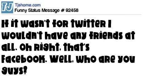 X If it wasn't for twitter I wouldn't have any friends at all. Oh right, that's Facebook. Well, who are you guys?