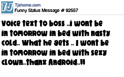 X Voice text to boss ..i wont be in tomorrow in bed with nasty cold.. What he gets .. I wont be in tomorrow in bed with sexy clown..thanx Android..!!