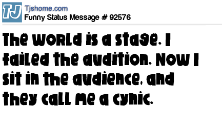 X says The world is a stage. I failed the audition. Now I sit in the audience, and they call me a cynic.