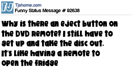 - # 197979 Why is there an eject button on the DVD remote? You still have to get up & take the disc out. It’s like having a remote to open the fridge.