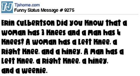 X is Erin Culbertson Did you know that a woman has 3 knees and a man has 4 knees? A woman has a left knee, a right knee, and a hiney. A man has a left knee, a right knee, a hiney, and a weenie.