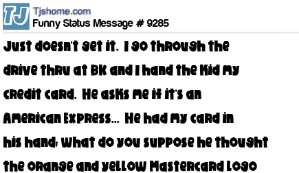 X just doesn't get it. I go through the drive thru at BK and I hand the kid my credit card. He asks me if it's an American Express... He had my card in his hand; what do you suppose he thought the orange and yellow Mastercard logo was?