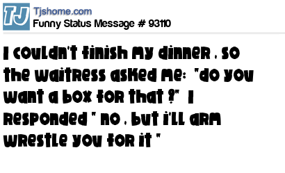 - # 93117 I couldn't finish my dinner , so the waitress asked me: "do you want a box for that ?" I responded " no , but i'll arm wrestle you for it "