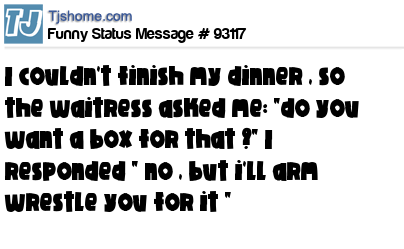 - # 93110 I couldn't finish my dinner , so the waitress asked me: "do you want a box for that ?" I responded " no , but i'll arm wrestle you for it "