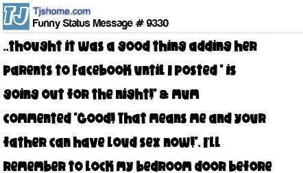 X ..thought it was a good thing adding her parents to Facebook until I posted " is going out for the night!" & mum commented "Good! That means me and your father can have loud sex now!". I'll remember to lock my bedroom door before I go out..