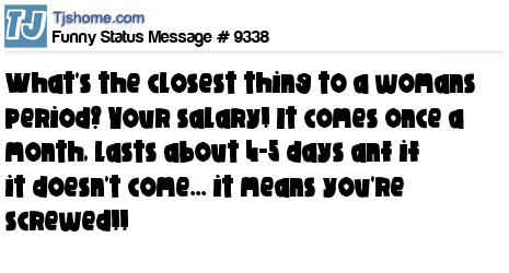 X says what's the closest thing to a womans period? Your salary! It comes once a month, lasts about 4-5 days anf if it doesn't come... it means you're screwed!!