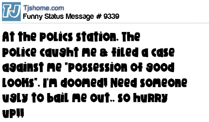 X is at the polics station. The police caught me & filed a case against me "possession of good looks". I'm doomed! Need someone ugly to bail me out.. so hurry up!!