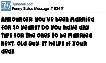 X says Announcer: You've been married for 50 years? Do you have any tips for the ones to be married next. Old guy: It helps if your deaf.
