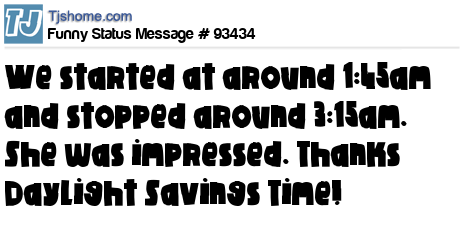X We started at around 1:45am and stopped around 3:15am. She was impressed. Thanks Daylight Savings Time!
