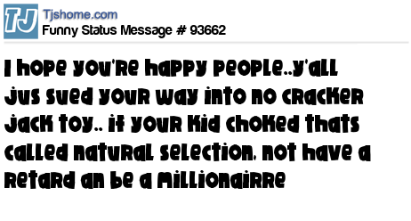 X is i hope you're happy people..y'all jus sued your way into no cracker jack toy.. if your kid choked thats called natural selection, not have a retard an be a millionairre