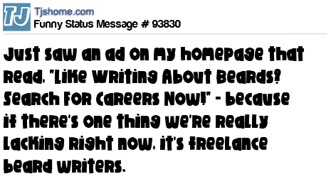 X is Just saw an ad on my homepage that read, "Like Writing About Beards? Search For Careers Now!" - because if there's one thing we're really lacking right now, it's freelance beard writers.