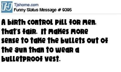 - # 105916 Birth control pills should really be made for men. It makes more sense to unload a gun than to shoot a bulletproof vest.