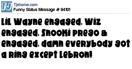 X Lil Wayne engaged, Wiz engaged, Snooki prego & engaged, damn everybody got a ring except Lebron!