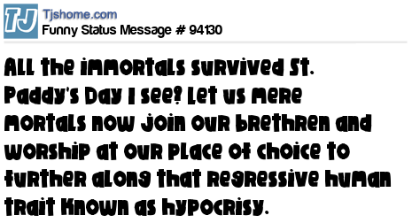X All the immortals survived St. Paddy's Day I see? Let us mere mortals now join our brethren and worship at our place of choice to further along that regressive human trait known as hypocrisy.