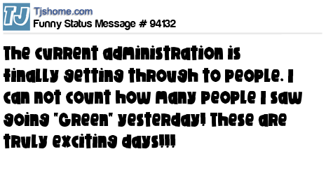 X says The current administration is finally getting through to people. I can not count how many people I saw going "Green" yesterday! These are truly exciting days!!!