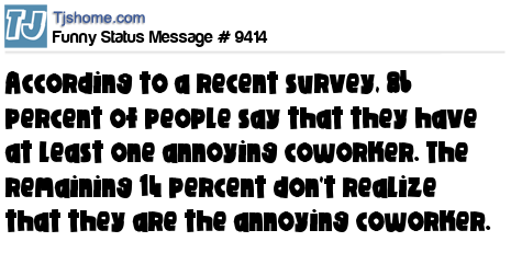 X According to a recent survey, 86 percent of people say that they have at least one annoying coworker. The remaining 14 percent don't realize that they are the annoying coworker.