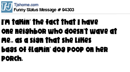 X  I'm takin' the fact that I have one neighbor who doesn't wave at me.. as a sign that she likes bags of flamin' dog poop on her porch.