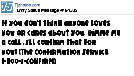 X If you don't think anyone loves you or cares about you, gimme me a call...I'll confirm that for you! (The Confirmation Service, 1-800-I-CONFIRM)